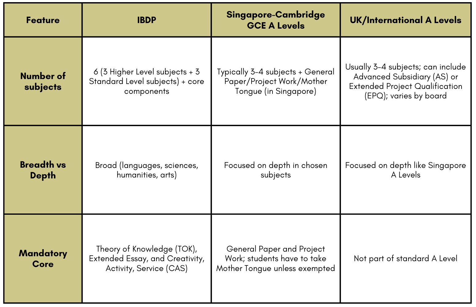 The IBDP, Singapore-Cambridge GCE A Levels, and UK/International A Levels each have different strengths: